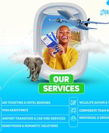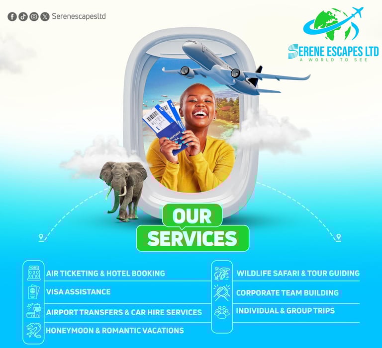 At Serene Escapes Ltd, we specialise in crafting unforgettable travel experiences, from thrilling local adventures to breath-taking international getaways. Whether you're exploring Uganda’s hidden gems like Murchison Falls and Queen Elizabeth National Park or embarking on a dream escape to Thailand, Dubai, Cape Town, or Zanzibar, we ensure seamless travel with expertly planned itineraries, comfortable accommodations, and exciting excursions. Our commitment is to provide stress-free, memorable journeys tailored to your desires. Let’s turn your travel dreams into reality—one escape at a time! 🌍✈️🏝️